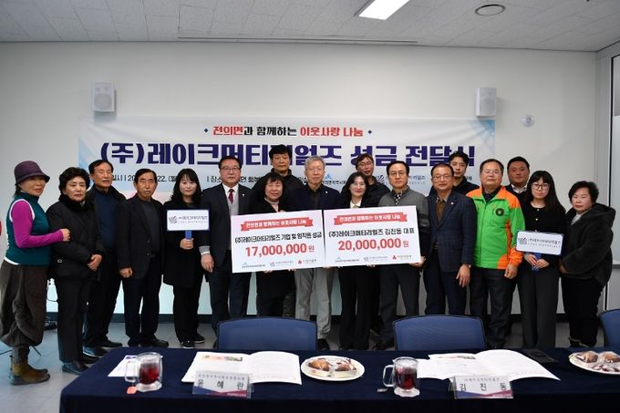[참좋은뉴스= 기자] 세종특별자치시 전의면지역사회보장협의체가 22일 전의면 행복누림터(복합커뮤니티센터)에서 ㈜레이크머티리얼즈로부터 성금 3,700만 원을 전달받았다.