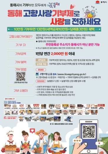 [참좋은뉴스= 기자] 동해시는 연말정산 시기를 맞아, 지속적인 기부 참여 분위기를 조성하고 고향사랑기부제 활성화를 도모하기 위해‘연말 추가 이벤트’를 추진한다.