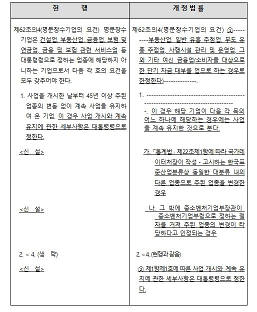 이에 따라 개정안은 일부 유흥·사행성 업종 등 일부를 제외하고, 건설업, 금융업, 보험업 등도 신청이 가능하도록 개선했다. 이를 통해 다양한 분야에서 모범적인 명문장수기업을 발굴할 수 있을 것으로 기대된다.