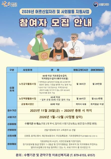 [참좋은뉴스= 기자] 관악구가 초고령시대 진입을 앞두고 어르신들의 사회참여 증진과 노후 소득 보장을 위해 ‘2026년 노인일자리 및 사회활동 지원사업’을 대폭 확대 추진한다.