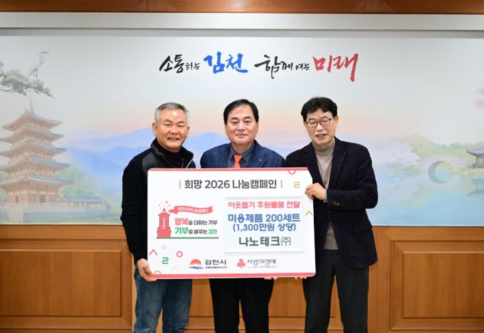[참좋은뉴스= 기자] 김천시는 지난 23일, 나노테크㈜(대표 김정헌)으로부터 어려운 이웃을 위한 미용 제품 200상자(1,300만 원 상당)를 전달받았다고 밝혔다.