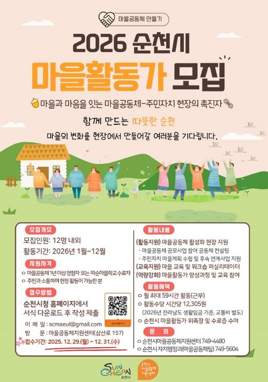 [참좋은뉴스= 기자] 순천시는 마을공동체 만들기 공모사업의 원활한 추진과 주민자치·마을공동체 활성화 등 따뜻한 순천을 함께 만들어갈 2026년 마을활동가 12명을 모집한다고 밝혔다.