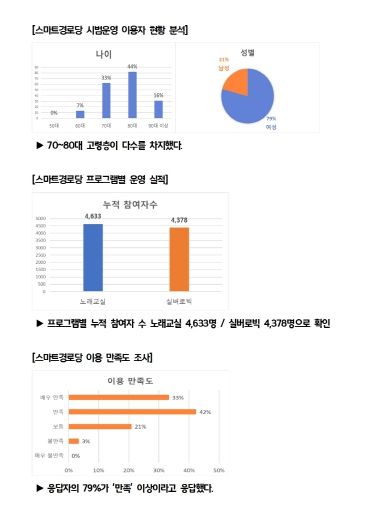 이용자 설문조사 결과에서도 긍정적인 반응이 이어졌다. 응답자의 96%가 사업 운영에 대해 긍정적(만족 이상 75%, 보통 21%)이라고 답했으며, 79%는 이후에도 계속 이용하겠다는 의사를 밝혔다. 이를 통해 사업의 지속 필요성이 확인됐고, 참여자 대부분이 70~80대 고령층으로 스마트경로당이 디지털 취약계층을 대상으로 효과적으로 운영된 것으로 분석됐다.