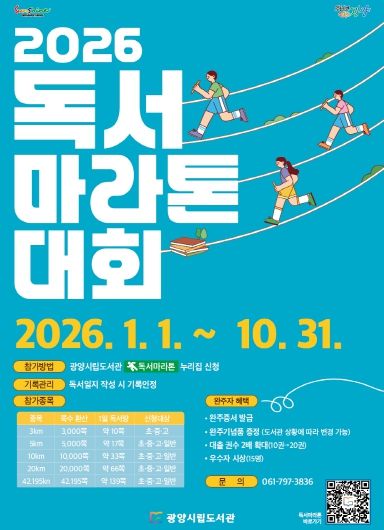 [참좋은뉴스= 기자] 광양시립도서관이 지역사회에 독서문화 확산을 위해 2026년 1월 1일부터 10월 31일까지 ‘2026 광양시 독서마라톤 대회’를 운영한다.