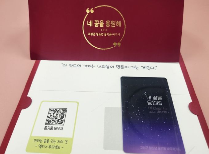 한편 고성군 청소년 꿈키움 바우처카드 누리집에서 가맹점, 사용 내역 및 잔액을 조회할 수 있으며, CGV고성 영화 예매도 가능하다.