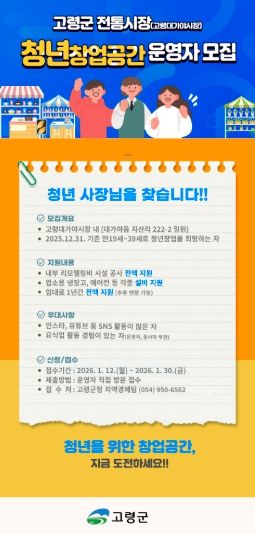 [참좋은뉴스= 기자] 고령군은 이달 말 30일까지 고령대가야시장 내 청년창업공간에 신규 점포를 운영할 만19~39세 청년 창업가를 모집한다고 밝혔다.
