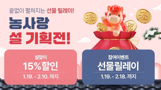 [참좋은뉴스= 기자] 충남도 대표 농특산물 온라인 쇼핑몰 충남농사랑이 한 해의 시작을 알리는 설 명절을 맞아 도내 농특산물의 소비 촉진, 지역 농가의 소득 증대와 함께 도민의 합리적이고 건강한 소비를 위해 19일부터 2월 10일까지 설 명절 기획전을 진행한다.