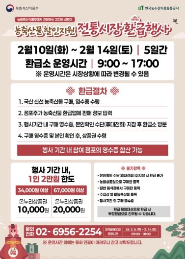 이번 행사는 농림축산식품부와 해양수산부가 주관하며, 전통시장에서 국산 농축·수산물을 구매한 소비자에게 구매금액의 일부를 온누리상품권(지류)으로 환급해 주는 방식으로 운영된다.