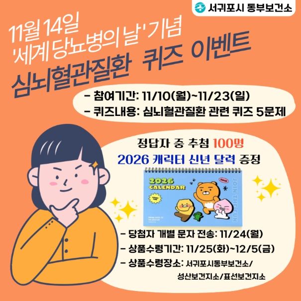 [참좋은뉴스= 기자] 서귀포시 동부보건소는 2025년 ‘세계 당뇨병의 날’을 기념하여 11월 10일부터 11월 23일까지 14일간 모바일 앱 ‘워크온’을 활용한 심뇌혈관질환 퀴즈 이벤트를 운영한다.