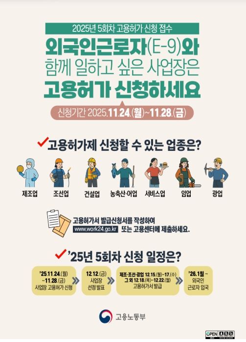 [참좋은뉴스= 기자] 고용노동부는 11월 24일부터 11월 28일까지 전국 지방고용노동관서를 통해 외국인근로자(E-9)에 대한 올해 5회차 신규 고용허가 신청을 받는다.