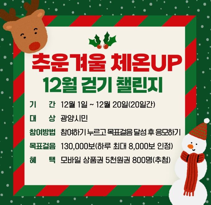 반미순 건강증진과장은 “겨울철은 활동량이 크게 줄어드는 시기인 만큼, 짧은 시간이라도 꾸준히 걷는 것이 건강 유지에 큰 도움이 된다”며 “이번 걷기 챌린지가 광양시민들의 걷기 습관 유지에 도움이 되기를 기대한다”고 말했다.