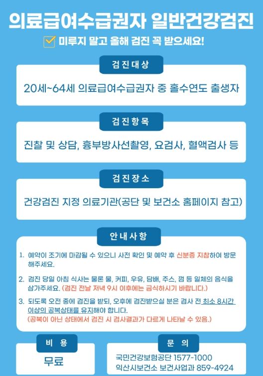 [참좋은뉴스= 기자] 익산시는 12월 31일까지 진행되는 '의료급여수급권자 일반건강검진'과 관련해 아직 검진을 받지 못한 대상자들에게 검진을 받을 것을 당부했다.