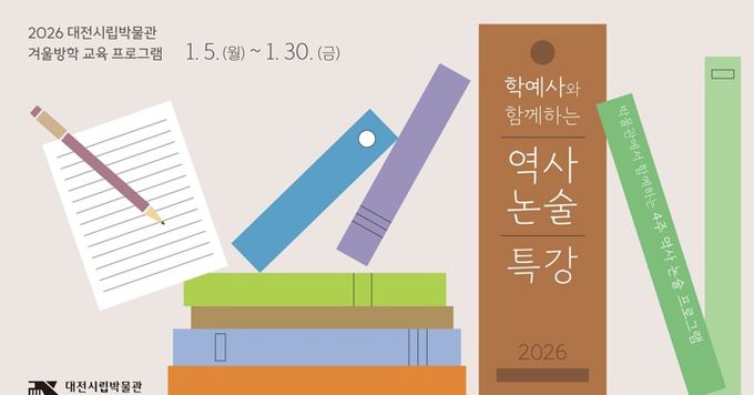[참좋은뉴스= 기자] 대전시립박물관은 겨울 방학 기간을 맞아 청소년의 역사 공부와 더불어 사고력 증진, 논술에 대비할 수 있는‘대전시립박물관 학예사와 함께하는 역사 논술 특강’을 2026년 1월 5일에서 30일까지 4주간 진행한다.
