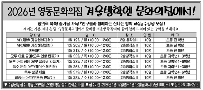 [참좋은뉴스= 기자] 영동문화의집은 2026년 겨울방학을 맞아 어린이들의 창의력과 감성을 키울 수 있는 겨울방학 특강 프로그램을 운영하고, 수강생을 모집한다.