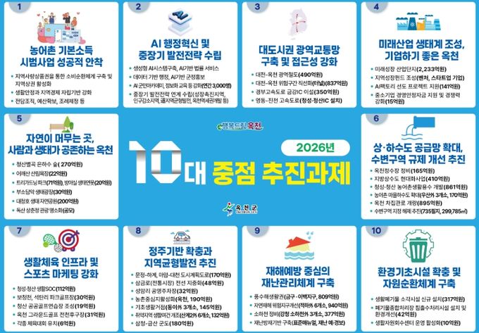 [참좋은뉴스= 기자] 옥천군이 26일 2026년 군정 운영의 핵심 방향을 담은 10대 중점 추진과제를 발표하고, 군민 삶의 질 향상과 지속가능한 지역성장을 위한 정책 추진에 나선다.
