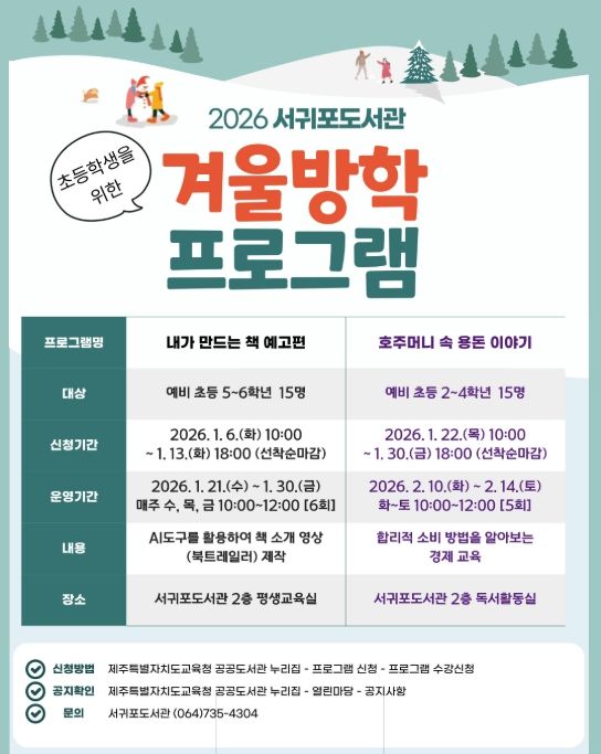 [참좋은뉴스= 기자] 제주도교육청 서귀포도서관은 겨울방학을 맞아 어린이들의 호기심을 자극해 책 읽기의 즐거움과 경제 감각을 키우는 겨울방학 프로그램을 운영하며, 내년 1월 6일부터 참가자를 모집한다.