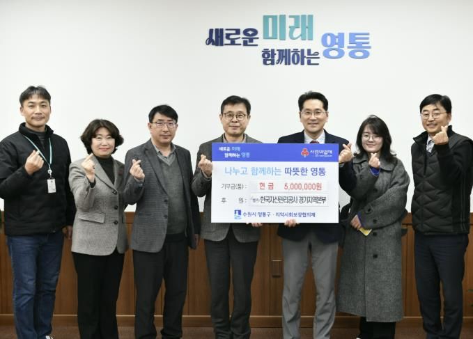 [참좋은뉴스= 기자] 수원시 영통구는 지난 24일 한국자산관리공사 경기지역본부에서 관내 경제적으로 어려움을 겪는 이웃을 위해 성금 500만 원을 기부했다고 밝혔다.