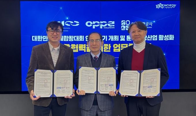[참좋은뉴스= 기자] 인천관광공사(사장 유지상)와 대한민국국제합창대회 조직위원회(위원장 김희철), ㈜놀던오빠들(대표 김준호)은 26일 인천관광공사에서 ‘대한민국국제합창대회 인천 개최(2026년~2030년) 및 문화관광 활성화’를 위한 업무협약을 체결했다.