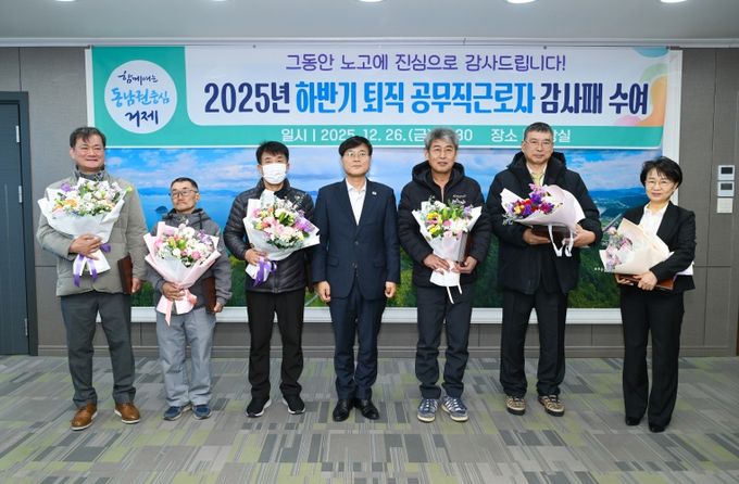 [참좋은뉴스= 기자] 거제시는 26일 시청 시장실에서 2025년 하반기 정년 퇴직을 맞은 공무직 노동자에게 감사패를 수여하며, 인생 제2막의 새로운 출발을 응원했다.