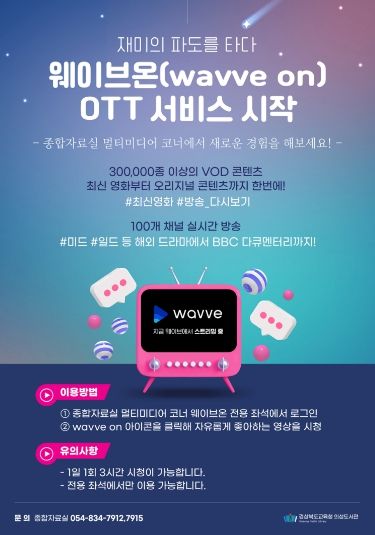 [참좋은뉴스= 기자] 경상북도교육청 의성도서관(관장 이미경)은 오는 13일부터이용자가 필요로 하는 영상을 실시간으로 제공하는 ‘웨이브온 VOD(Video On Demand)’ 서비스를 운영한다고 밝혔다.