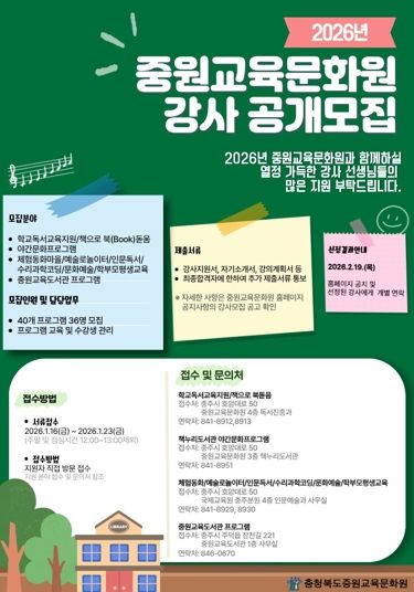 [참좋은뉴스= 기자] 충청북도교육청 직속기관 중원교육문화원은 23일까지 학생과 학부모, 지역주민을 대상으로 운영하는 2026년도 인문독서 및 문화예술 프로그램 강사를 공개 모집한다고 밝혔다.