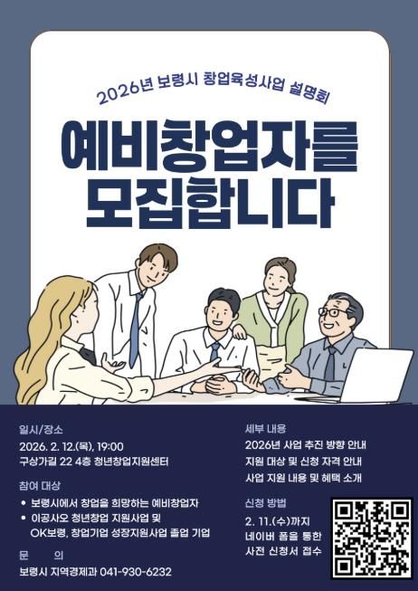 [참좋은뉴스= 기자] 보령시는 오는 2월 12일 오후 7시 청년창업지원센터에서 예비창업자 및 창업기업을 대상으로 ‘2026년 창업육성사업 설명회’를 개최한다.