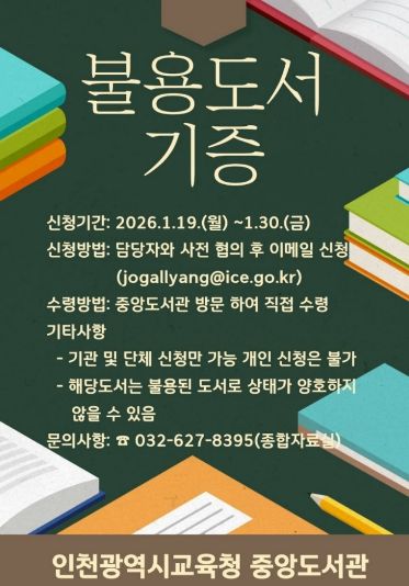 [참좋은뉴스= 기자] 인천광역시교육청중앙도서관은 지역사회 내 도서 나눔 문화를 확산하고 지식 자원의 선순환을 실천하기 위해 ‘불용도서 기관 나눔’ 사업을 운영한다.