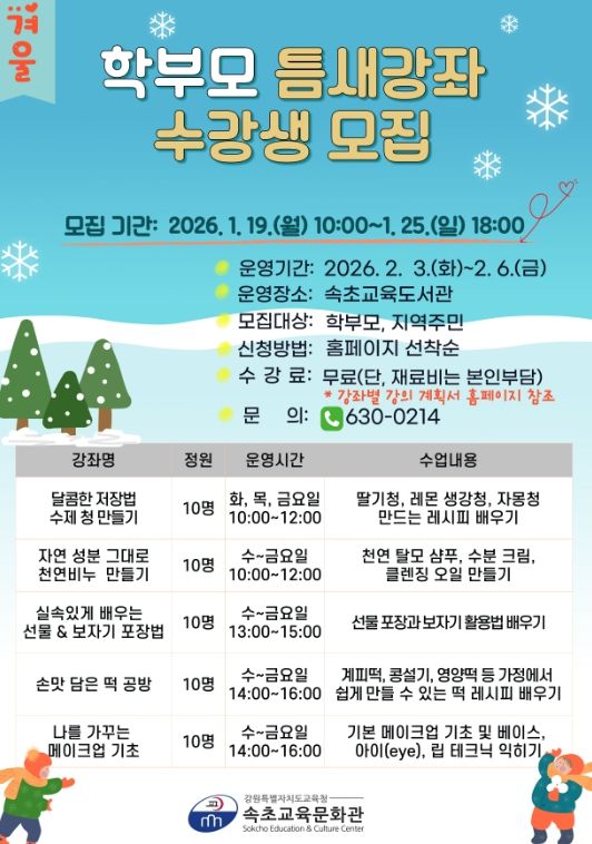[참좋은뉴스= 기자] 속초교육문화관은 3월 정규 강좌 개강에 앞서 학습 공백기를 활용한 학습 기회를 제공하고자, 2월 3일부터 6일까지 학부모와 지역주민을 대상으로 ‘겨울 학부모 틈새강좌’를 운영한다.