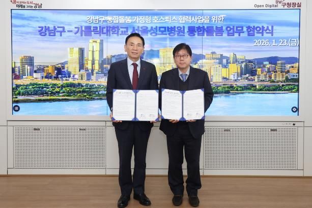 [참좋은뉴스= 기자] 꿈이 모이는 도시, 미래를 그리는 강남구가 1월 23일 구청에서 가톨릭대학교 서울성모병원과 ‘강남구 통합돌봄 가정형 호스피스 협력사업’ 추진을 위한 업무협약(MOU)을 체결했다. 이 협약은 자치구와 상급종합병원이 연계해 가정형 호스피스를 지원하는 체계를 공식화했다는 점에서 그 의미가 크다.