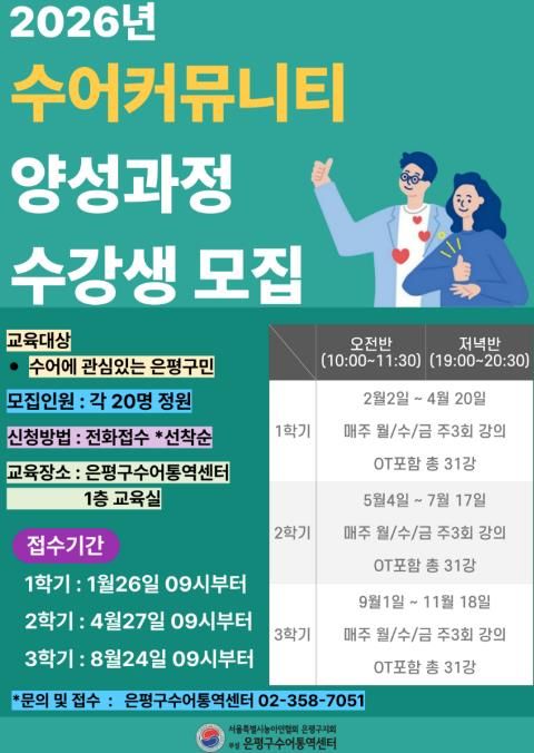 [참좋은뉴스= 기자] 서울 은평구는 ‘2026년 수어커뮤니티 양성과정’ 1학기 수강생을 26일 오전 9시부터 선착순으로 20명을 모집한다고 밝혔다.