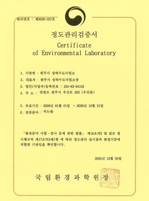 [참좋은뉴스= 기자] 원주시 먹는물 검사기관이 국립환경과학원이 주관한 ‘2025년 먹는물 검사기관 정도관리 평가’에서 엄정한 심사를 거쳐 ‘적합’ 판정을 받았다. 이에 따라 2026년 1월 1일부터 2028년 12월 31일까지 유효한 ‘정도관리 검증서’를 공식 획득했다.