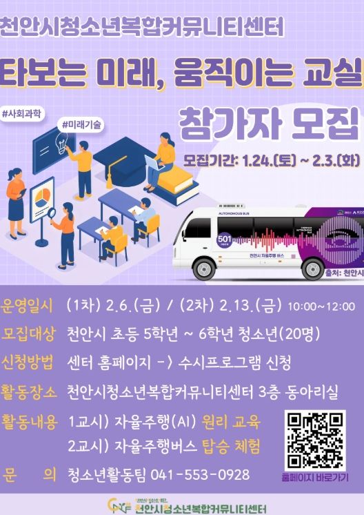 [참좋은뉴스= 기자] (재)천안시청소년재단 천안시청소년복합커뮤니티센터가 겨울방학을 맞아 자율주행버스를 직접 타보고 미래 기술을 배우는 ‘타보는 미래, 움직이는 교실’ 참가자를 모집한다고 26일 밝혔다.