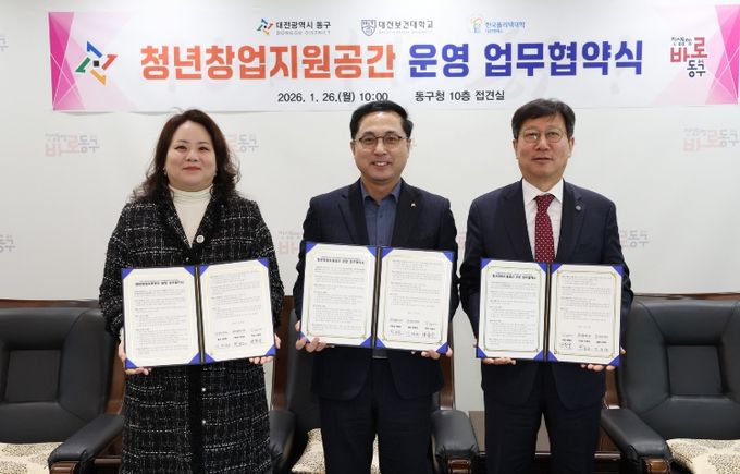 [참좋은뉴스= 기자] 대전 동구는 26일 대전보건대학교(총장 이정화)‧한국폴리텍Ⅳ대학 대전캠퍼스(학장 양형규)와 청년창업지원공간 운영을 위한 업무협약(MOU)을 체결했다고 밝혔다.