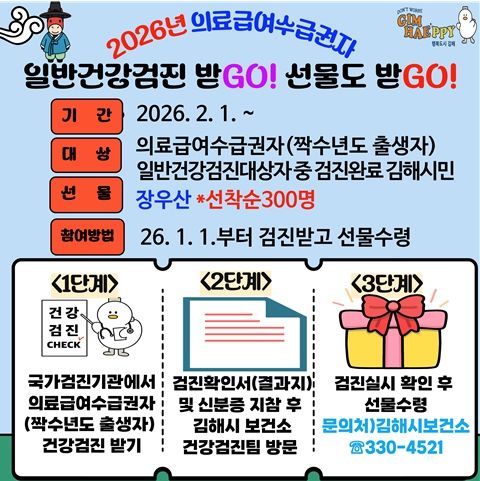 [참좋은뉴스= 기자] 김해시보건소는 2026년 새해를 맞아 의료 취약계층의 질병을 조기에 발견하고 예방하기 위해 의료급여수급권자를 대상으로 『일반건강검진 받GO! 선물도 받GO!』 이벤트를 실시한다고 밝혔다.