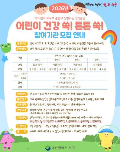 [참좋은뉴스= 기자] 대전 서구는 27일까지 2026년도 어린이 건강증진 프로그램 ‘어린이 건강 쑥! 튼튼 쑥!’ 참여 기관을 모집한다.