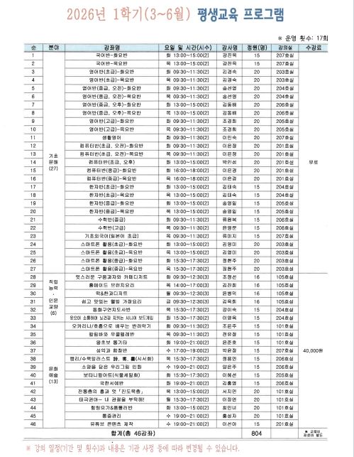 이번 학기에는 공모를 통해 선정된 46개 프로그램과 지역 우수강사의 재능을 활용한 12개 재능기부 프로그램 등 총 58개 강좌를 운영한다. 교육 과정은 영어 및 컴퓨터 등 기초문해 과정, 요리 및 동화구연지도사 등 직업능력·인문교양 과정, 통기타·민화·태극권 등 문화예술 과정으로 구성했다. 상반기 교육은 3월 3일부터 6월 29일까지 17주간 진행할 예정이다.