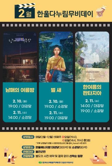 2월에는 ‘청춘과 성장’을 주제로 독립영화 '남매의 여름밤', '벌새', '한여름의 판타지아'를 상영할 예정이다. 연간 상영 일정 등 자세한 내용은 한울본부 홈페이지 공지 게시판과 인스타그램에서 확인할 수 있으며, 기타 문의는 한울본부 홍보부로 하면 된다.