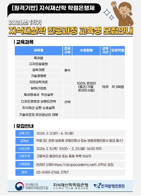 [참좋은뉴스= 기자] 지식재산처 국제지식재산연수원은 한국발명진흥회와 공동으로 2월 5일부터 23일까지 지식재산학 학점은행 과정에 대한 온라인 수강생을 모집한다.
