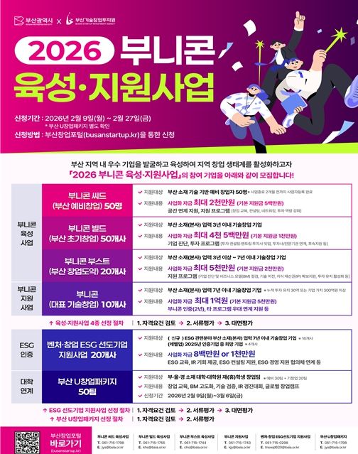 [참좋은뉴스= 기자] 부산시와 부산기술창업투자원은 지역 내 우수 기술 창업 기업을 발굴하고 부산형 유니콘 기업인 '부니콘(Bunicorn)'으로 육성하기 위해 '2026 부니콘 육성·지원사업' 참여 기업을 통합 모집한다고 밝혔다.