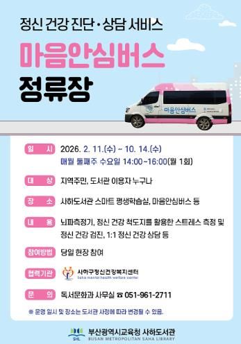 [참좋은뉴스= 기자] 부산광역시립사하도서관은 오는 2월부터 10월까지 매월 둘째 주 수요일마다 도서관 스마트 평생학습실과 마을안심버스에서 지역주민을 대상으로 ‘마을안심버스 정류장’을 운영한다.
