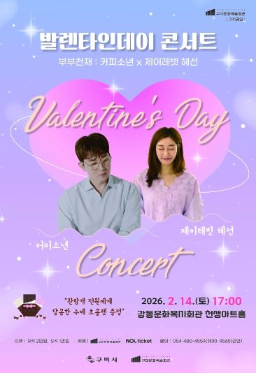 [참좋은뉴스= 기자] 구미시는 오는 2월 14일 오후 5시, 강동문화복지회관 천생아트홀에서 발렌타인데이 콘서트〈부부천재 : 커피소년 x 제이레빗 혜선〉을 개최한다.