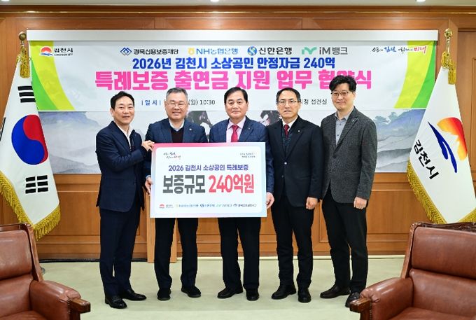 [참좋은뉴스= 기자] 김천시는 관내 소상공인 경영 안정자금 지원을 위해 경북신용보증재단, NH농협은행, 신한은행, iM뱅크와 협약을 맺고 총 240억 원 규모의 소상공인 특례 보증 지원에 나선다고 9일 밝혔다.