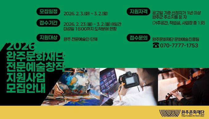 [참좋은뉴스= 기자] (재)완주문화재단(이사장 유희태)은 2026년 한 해 동안 지역 예술인의 안정적인 창작활동을 지원하기 위해 2026 전문예술창작지원사업에 참여할 예술인 및 예술단체를 모집한다.
