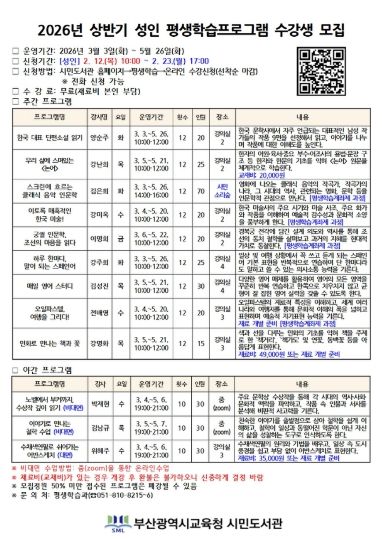 [참좋은뉴스= 기자] 부산광역시립시민도서관(관장 이은경)은 3월부터 5월까지 유아, 어린이, 성인 등 560여 명을 대상으로 26개 평생학습프로그램을 운영한다. 프로그램은 전 연령층의 다양한 학습 수요를 반영해 구성했으며, 특히 어린이 대상 문해력·수리력 등 기초역량 강화 프로그램을 확대 운영한다.