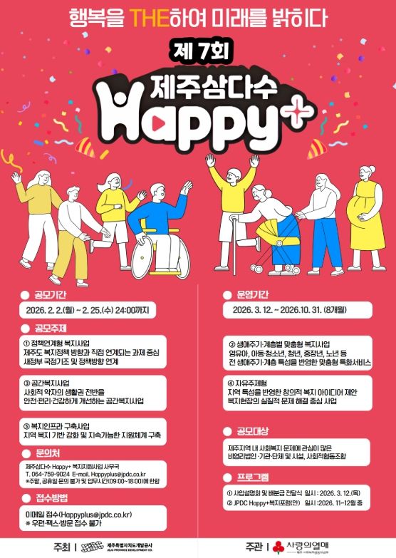 [참좋은뉴스= 기자] 제주삼다수를 생산·유통하는 제주특별자치도개발공사(사장 백경훈)는 도내 복지 사각지대 해소를 위한 혁신적인 아이디어를 발굴하는 ‘제7회 제주삼다수 Happy+ 복지 지원사업’의 공모 접수가 오는 25일 마감된다고 밝히며, 도내 역량 있는 단체들의 적극적인 참여를 독려했다.