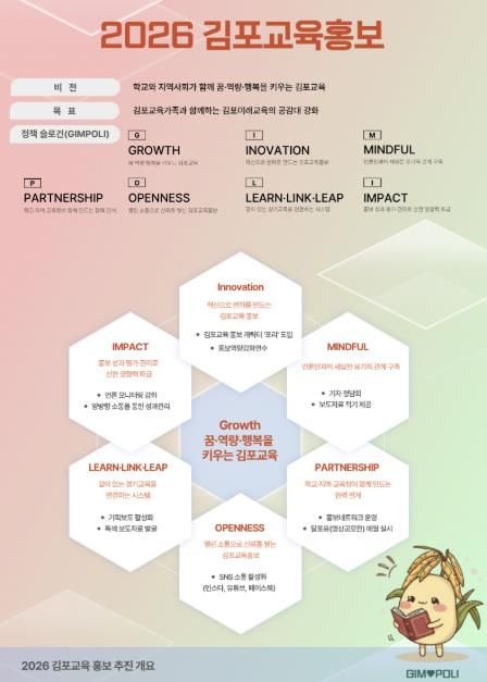 2026년 김포교육 홍보 정책의 핵심은 김포교육 공식 홍보 캐릭터 ‘포리(POLI)’ 도입이다. 포리는 김포(GIMPO)와 배움(Learn), 연결(Link), 도약(Leap)의 의미를 담은 상징 캐릭터로, 김포의 대표 상징인 볍씨를 모티브로 하여 학생의 성장 가능성과 미래교육 가치를 표현하고 있다.