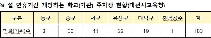 [참좋은뉴스= 기자] 대전시교육청은 설 연휴 기간인 2월 14일부터 18일까지 대전을 찾는 귀성객과 지역 주민의 주차 편의를 위해 관내 각급 학교와 교육청, 산하기관 등 총 183곳의 주차장을 무료로 개방한다고 밝혔다.