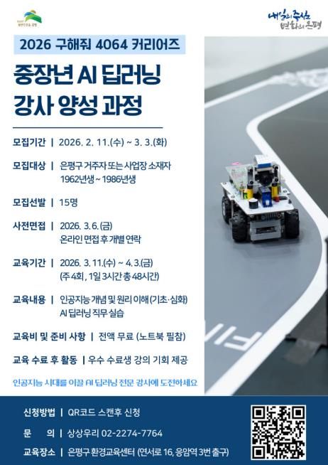 참여 대상은 AI·디지털 교육 강사 활동을 통해 재취업 또는 직무 전환을 희망하는 40~64세(1986~1962년생) 은평구 중장년이며, 신청은 다음 달 3일까지 포스터에 안내된 큐알(QR)코드를 통해 접수할 수 있다.