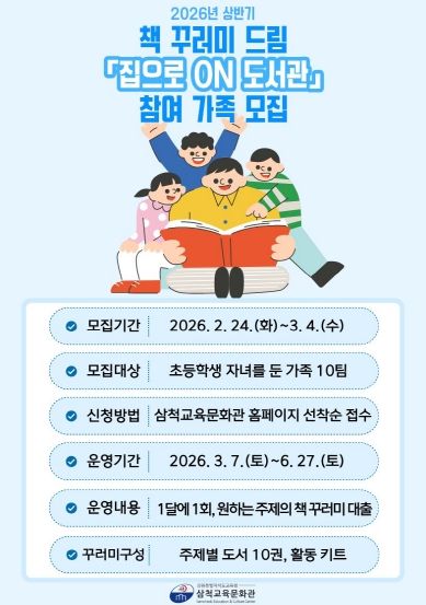 [참좋은뉴스= 기자] 삼척교육문화관은 3월부터 6월까지 가족 단위 독서 문화를 장려하기 위하여 초등학생 자녀를 둔 가족을 대상으로 책 꾸러미 드림 ‘집으로 온(ON) 도서관’을 운영한다.