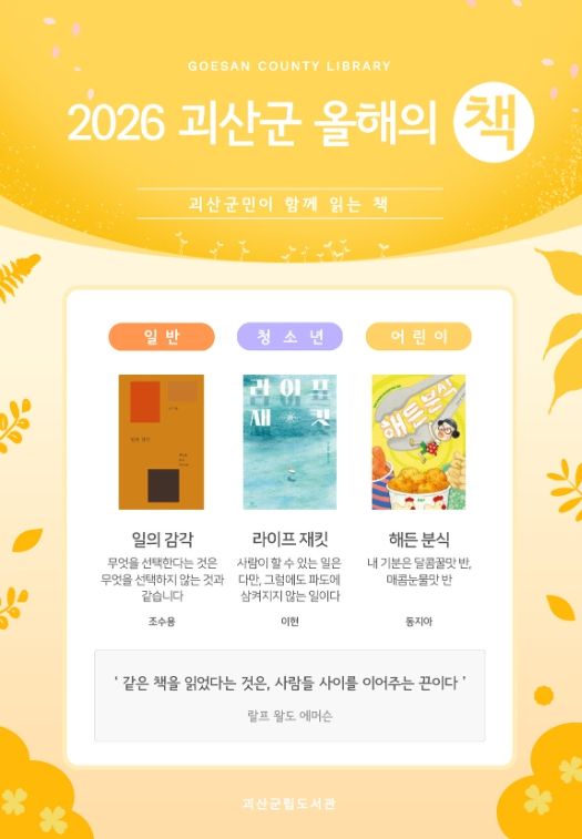 [참좋은뉴스= 기자] 충북 괴산군립도서관이 2026년 괴산군 올해의 책으로 일반, 청소년, 아동 분야 각 1권씩 총 3권을 최종 선정했다고 20일 밝혔다.